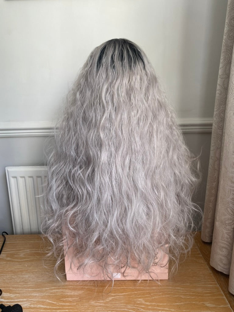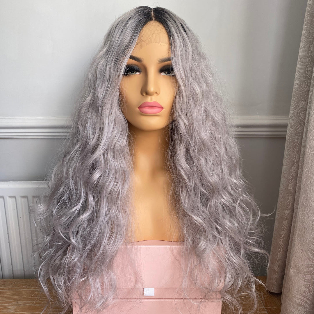 Make a statement with stunning mermaid waves! This ultra-voluminous, super-thick wig features soft spiral waves in a mesmerizing silver-grey hue, perfectly blended with natural dark roots for added depth. Whether you're rocking it for everyday glam or making waves at festivals, this 26-inch beauty is designed to turn heads wherever you go.